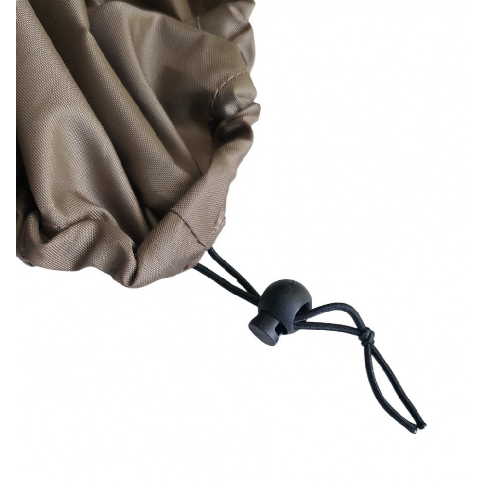 По всему периметру вшита резинка с фиксатором, которая обеспечивает плотное прилегание к контуру кресла, предотвращая парусность на ветру. Дополнительная стяжка на резинке с пластиковой защелкой (фастексом) надежно удерживает накидку на месте даже в штормовую погоду.